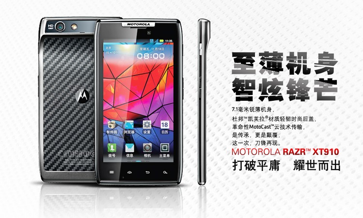Motorola 摩托罗拉 Razr XT910 3G手机 简约的设计风格彰显着属于该机的大气稳重的王者风,屏幕方面,采用4.3英寸分辨率为960×540像素的AMOLED电容屏,支持多点触控。机身尺寸为130.7×68.9×7.1mm,重127g, 配备主频高达1228MHz的德州仪器 OMAP4430的双核处理器、内置1GB RAM的内存加上16GB/32GB的内置存储容量,运行速度非常流畅,同时内置蓝牙、WIFI、GPS等常用功能。该机内置一枚800万像素摄像头,支持1080p的视频录制和播放,该机加入了一枚1800mAh的电池,延续其续航能力的强悍