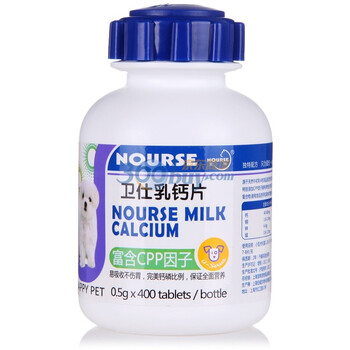 NOURSE卫仕是国内宠物产品品牌。这款U系列犬用乳钙片内含钙、铁、锌等多种矿物质,特别添加CPP因子,易与钙结合,宠物可完全吸收,促进骨骼生长,强健骨骼和牙齿。适用范围:妊娠、哺乳期宠物的钙质补充,宠物骨骼生长需要以及任何年龄段宠物的日常钙质补充。食用方法:小型犬和猫1-2片/天,中型犬3-4片/天,大型犬5-6片/天,巨型犬7-8片/天,含量400片。