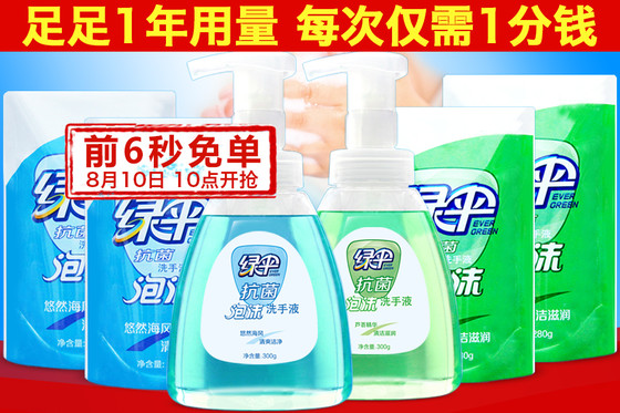 10点免单:0元包邮 绿伞 抗菌泡沫洗手液家庭1年量300g*2瓶+280g*4袋