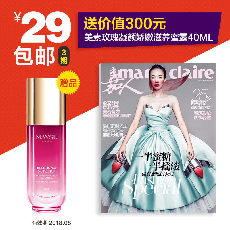 首页>促销活动>29元包邮 Marie Claire 嘉人 2016年季度3期 赠美素玫瑰凝颜娇嫩滋养蜜露 40ml