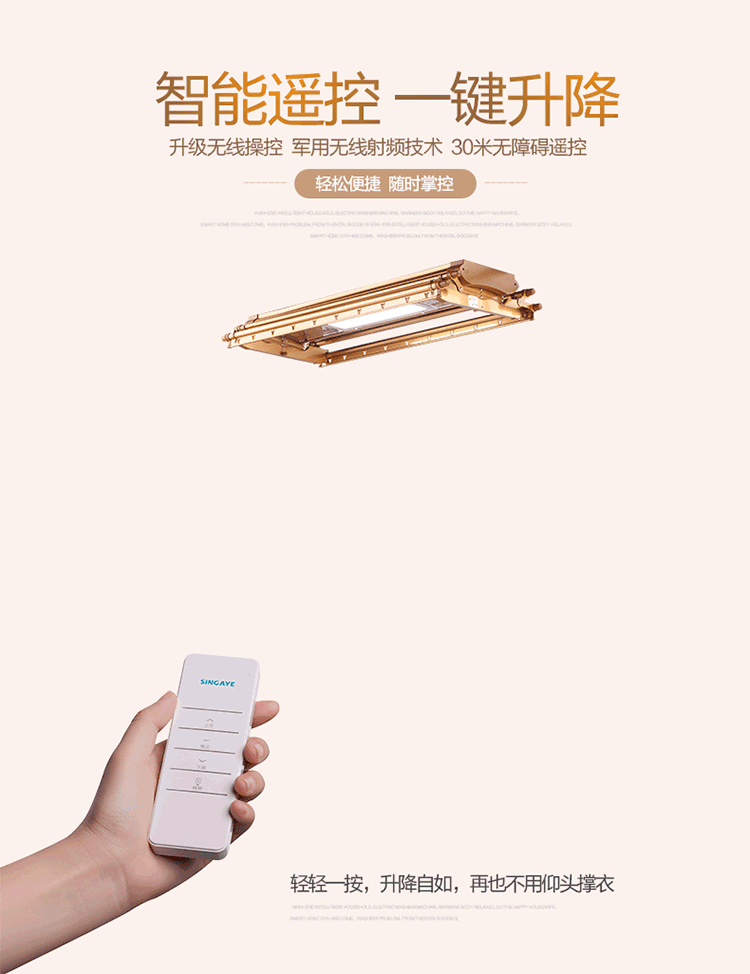 SINGAYE 心家宜 D04 电动晾衣架,一键升降,无线遥控,30米无障碍遥控。采用航空铝材,有LED照明灯板,15w环保型灯源,自动保护功能,电流过压过载自动保护。升降过程遭遇阻碍,自动停止运行。