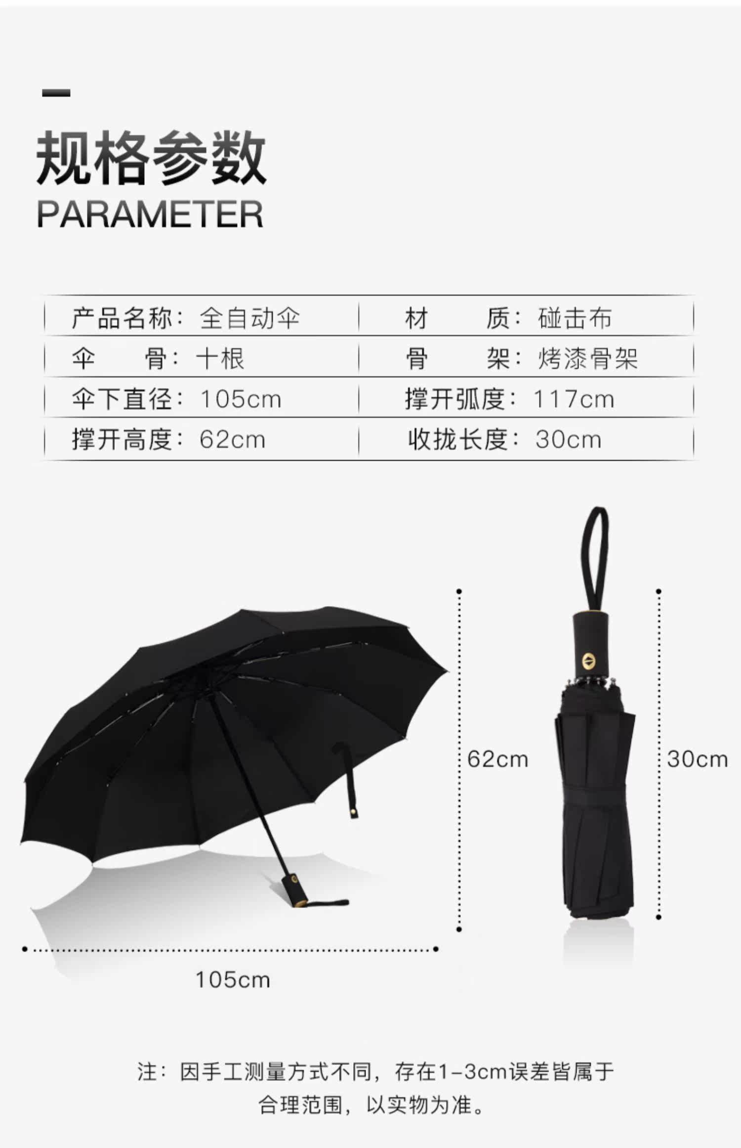 遮阳防雨防紫外线两用,黑胶折叠伞,方便实用,无惧湿身,超强抗风,单手操作,自动开关,好伞品质,经得起时间丈量~
