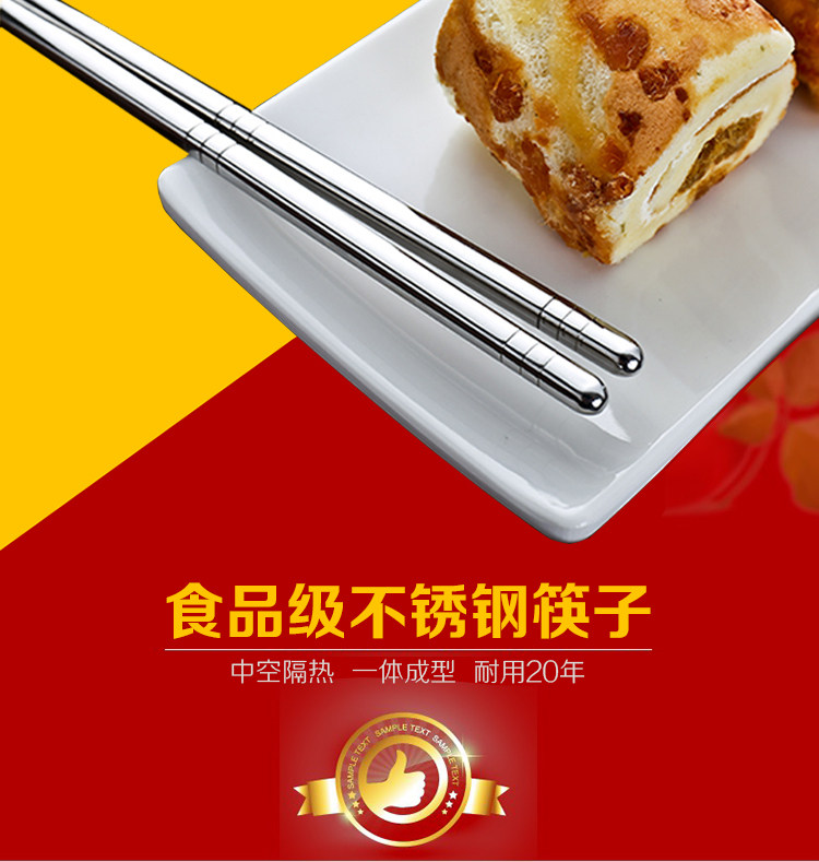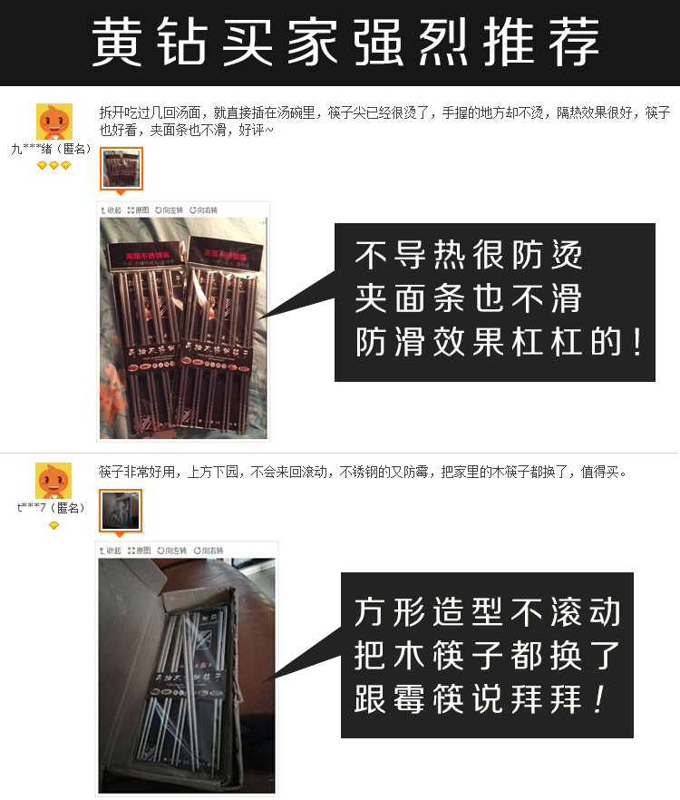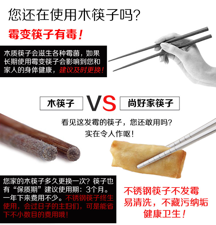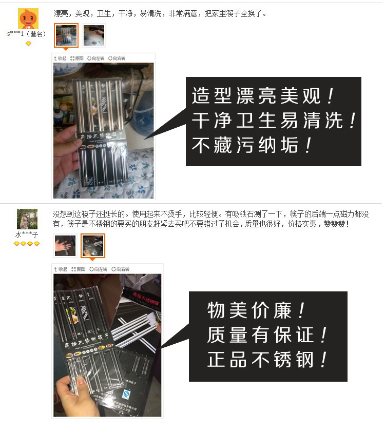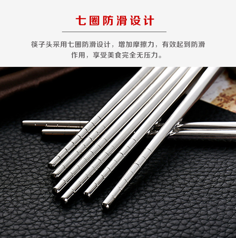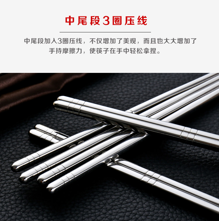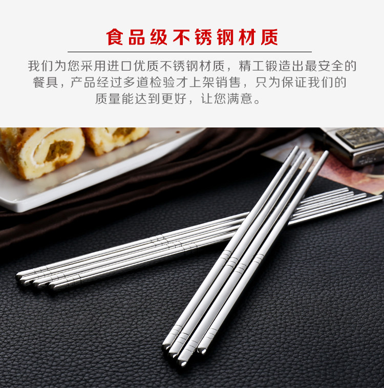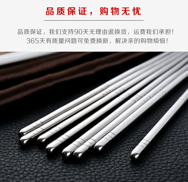 家庭必备餐具,防滑不锈钢筷子,手感舒适,易于掌控,干净卫生,外观时尚,安全材质,居家好帮手! 我们承诺:我们的不锈钢筷子品质保证,支持90天无条件退换货,运费我们承担!365天内有质量问题均可免费换新!好品质总经得起考验,不偷工减料!模板保护代码模板保护代码模板保护代码