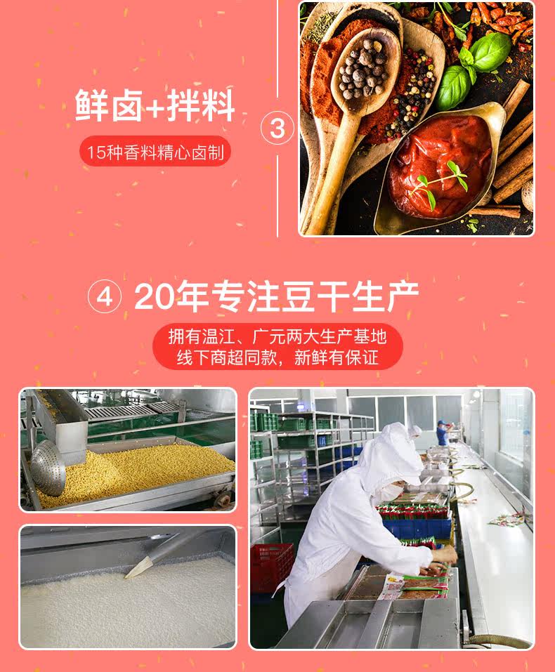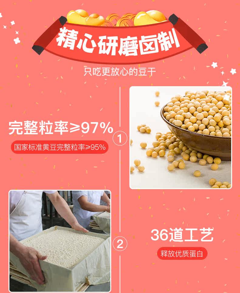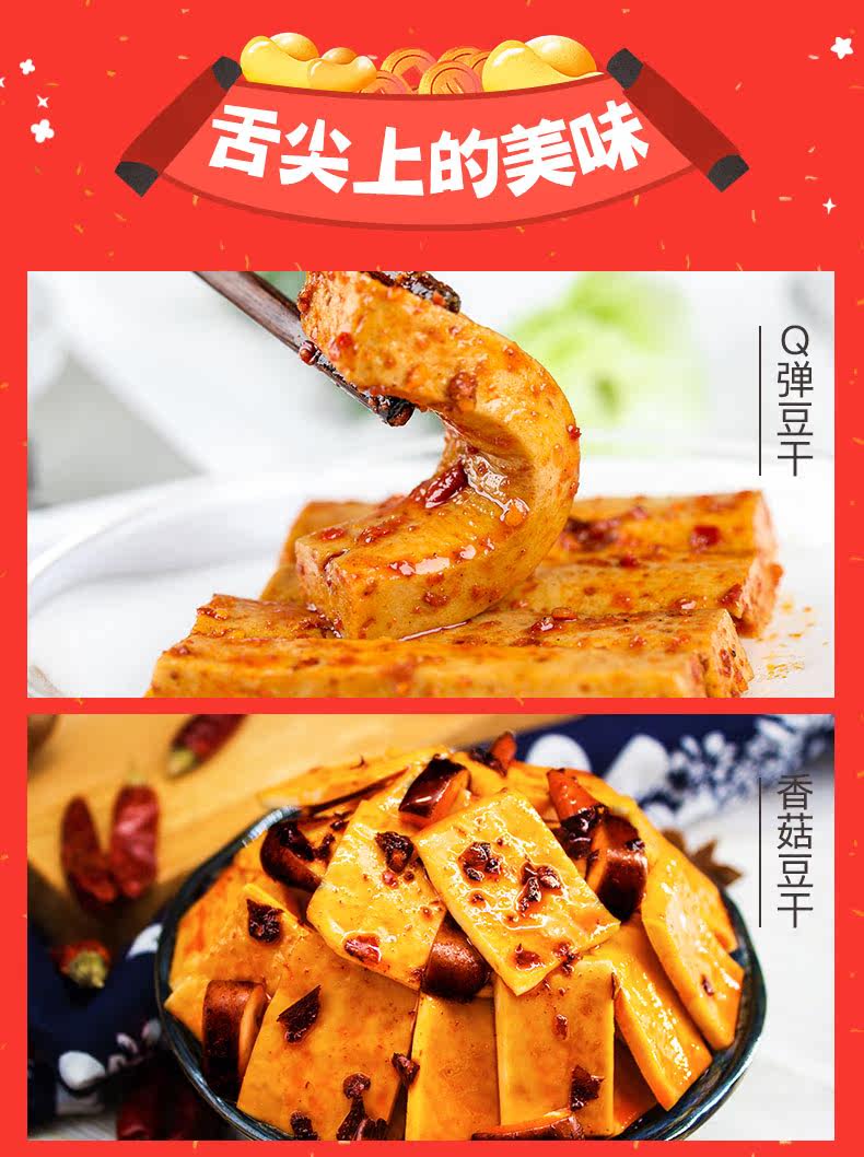 超大容量更多满足!Q弹豆干,多种味道可选,肉香醇厚的鱼糜,大豆的浓香,颗颗入味,似肉非肉,多种口味可选,香味四溢,弹滑嚼劲,享受味蕾的美味,根本停不下来!