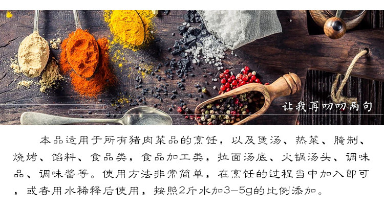 优质的猪肉、猪骨经酶解反应,配以法国香素经科学工艺制成,天然健康,鲜香味美,自然流畅,体现原料原汁原味,增强食物本身的鲜香滋味,赋予食物鲜香味,激活食物潜在的美味。