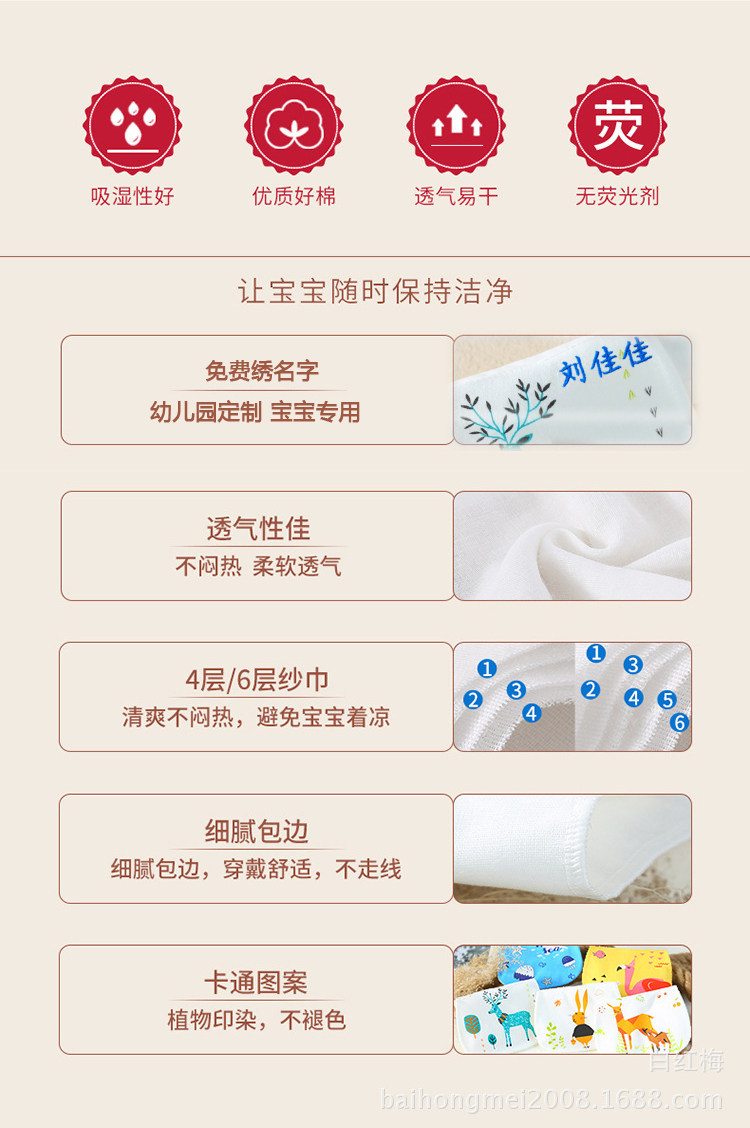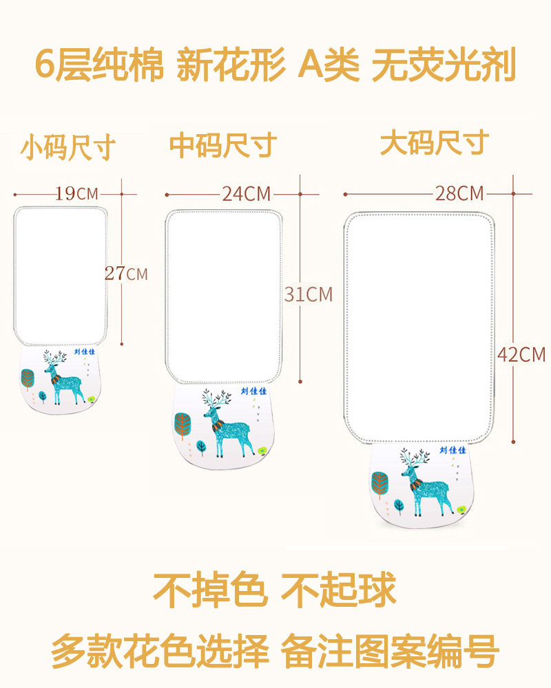 卡通图案,会呼吸的汗巾,纯棉纱布,柔软亲肤透气,四季皆宜,易清洗快洗快干,汗巾预防感冒,保持宝宝干爽。 4层汗巾比较薄只适合夏天用,6层比较厚适合冬夏天用。如果不清楚4层与6层的区别的亲们或宝宝出汗大的,我们建议建议买6层的。绣名字属于定做品,下单付款30分钟后,会马上进入制作流程,所有定做内容,便无法修改,付款30分钟后,不支持退款,不支持更改其它内容。请各位谅解。谢谢。