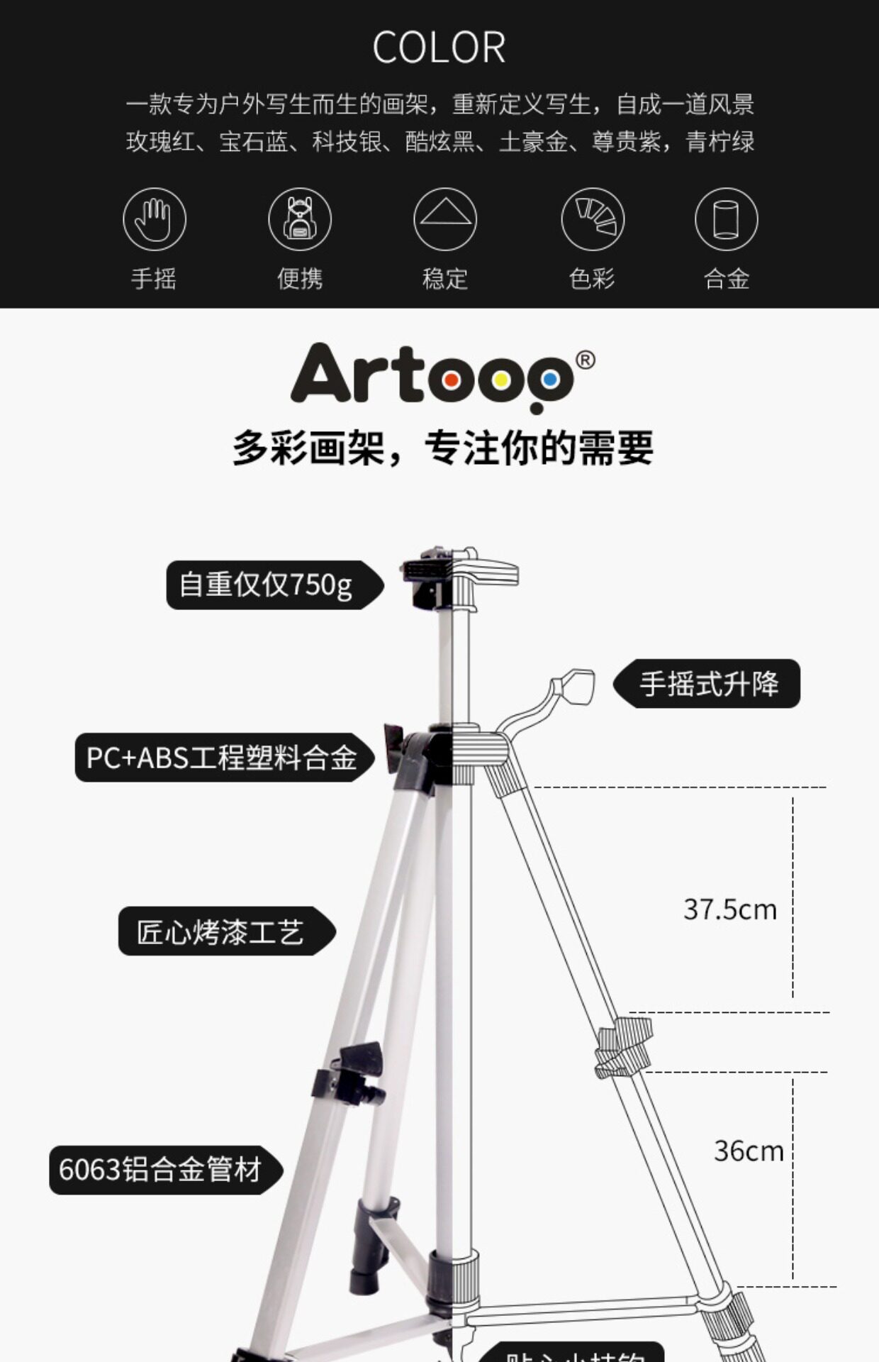 【天猫】一款为户外写生而生的画架子,8色可选,贴心小勾,自重仅750克,方便携带,好安装,遇到风也不怕的手摇式画架【赠运费险】