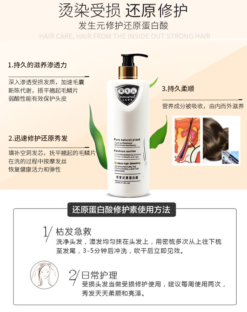 线下沙龙合作品牌,1000ml大容量的营养酸还元蛋白,快速渗透,急速修复,深度滋养修护染烫受损秀发,改善毛躁,令秀发持久柔顺光泽,一次使用就能看到效果!