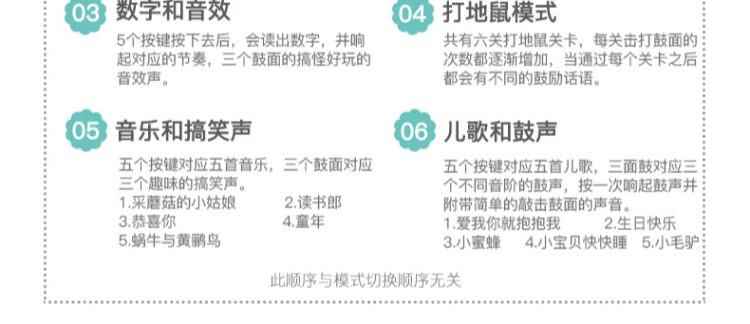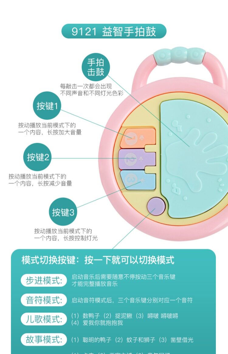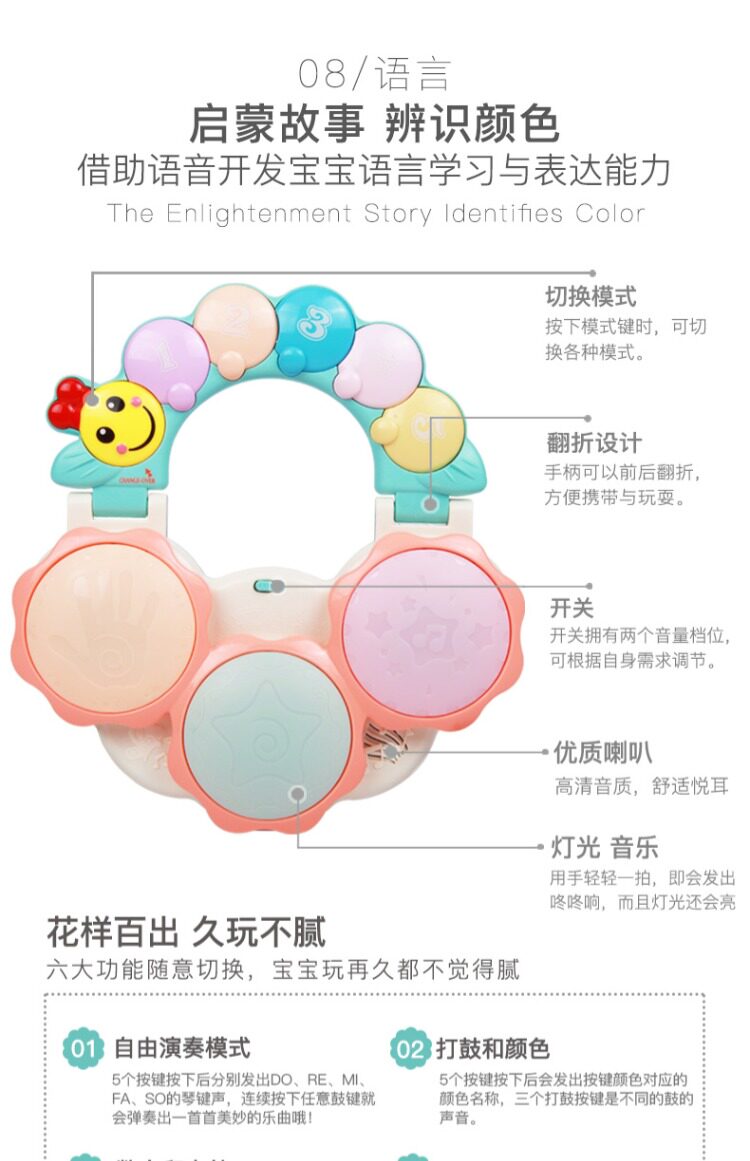 动听音乐,唯美灯光,益智健康,环保安全,多种音乐灯光模式,配色清新,锻炼宝宝动手能力~