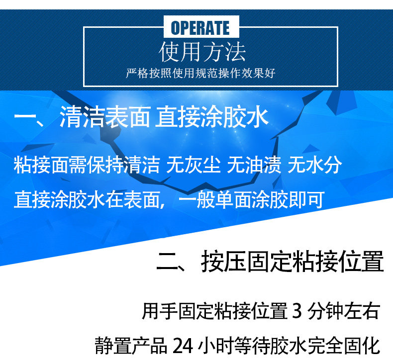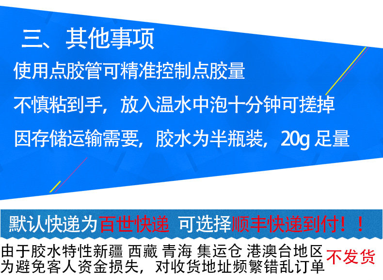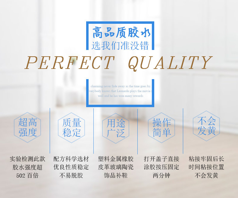 万能强力胶水,专业防水速干胶,5秒速干强力粘胶,防水防热不脱胶,集瞬干胶和树脂胶双重优点于一身,多功能用途,粘接木头金属皮革陶瓷玻璃塑料等等,环保无刺激性气味,家中必备,粘住你就别想脱掉~