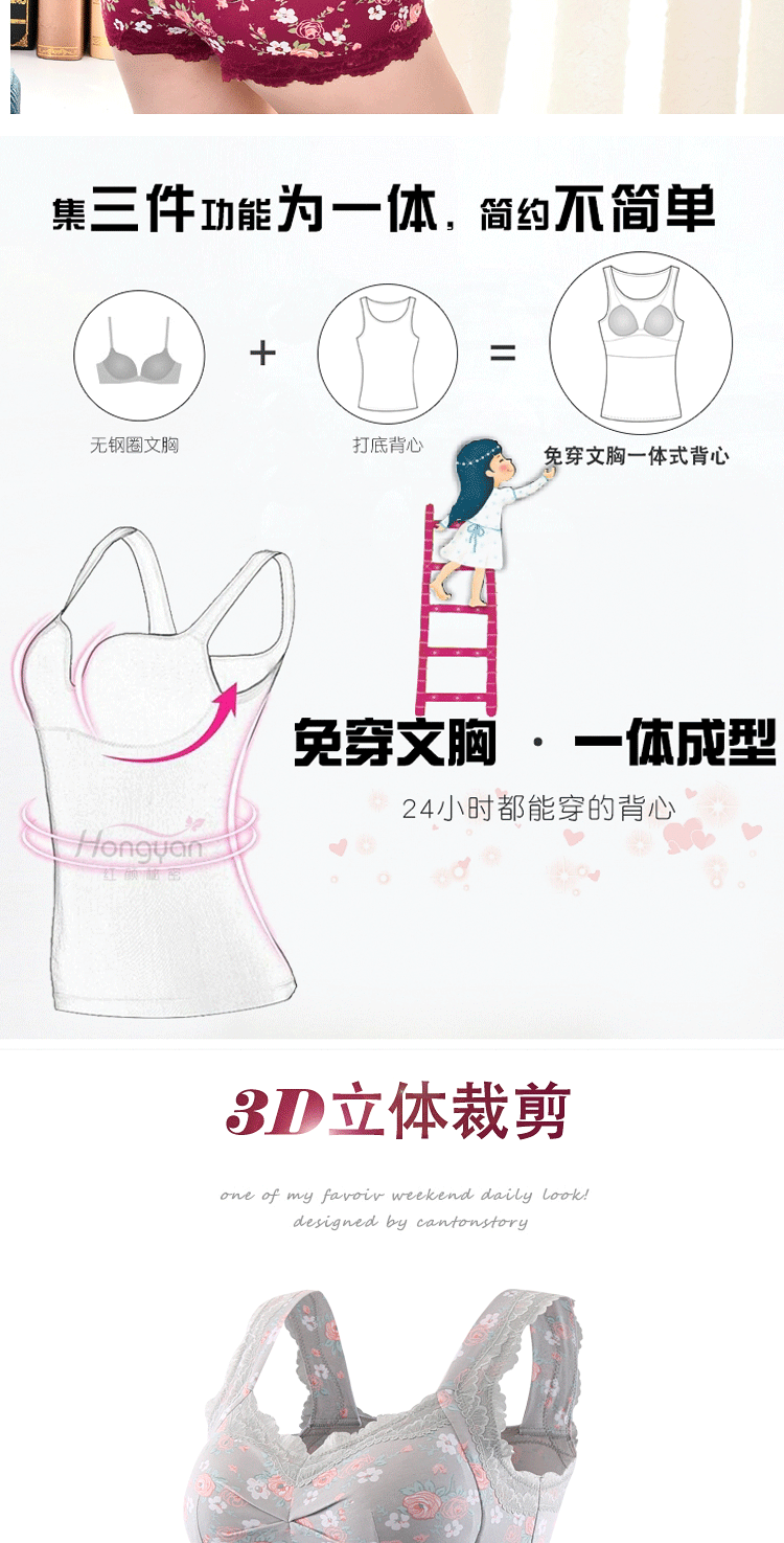 无钢托设计缓解对胸部的压迫,可拆卸按摩全杯型,方便自换罩杯,全杯型更好包住乳房,不变形,轻盈贴身,肌肤合为一体。 红颜秘密の设计理念“关爱乳房,免穿文胸”可拆卸仿生手指按摩胸垫,无钢托结构设计缓解对胸部的压迫,甄选亲肤棉质/性感蕾丝面料,女性在睡眠、运动、打底、及怀孕哺乳期都可以放心穿戴。红颜秘密一体式胸衣不仅是健康自由的崇尚,更是时尚品质的追求!