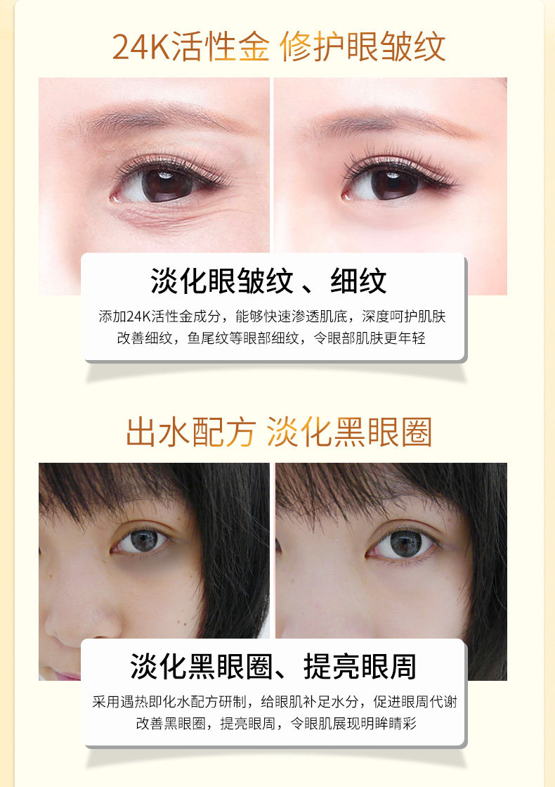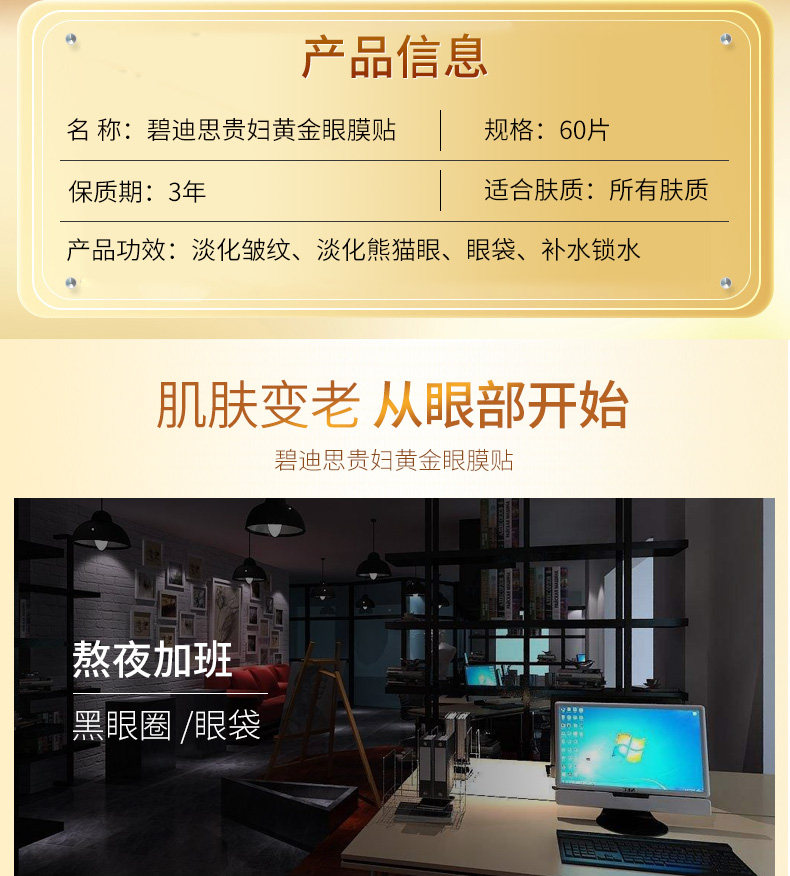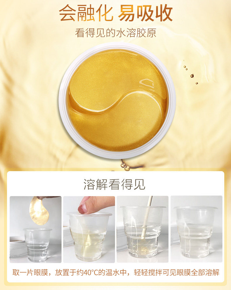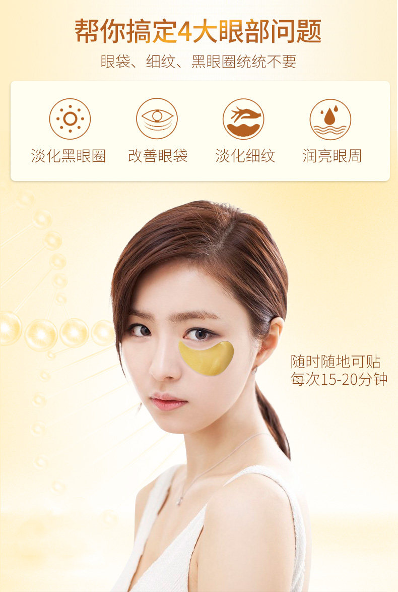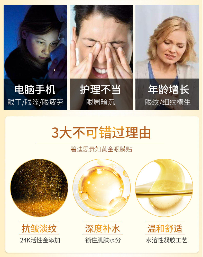 【碧迪思旗舰店】黄金贵妇眼贴膜,24K活性金添加,淡化熊猫眼、淡化眼袋,抗皱淡纹、补水锁水,水溶性凝胶工艺遇温即化,越敷越薄能释放出丰富的水分和养分。