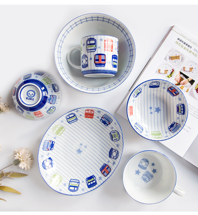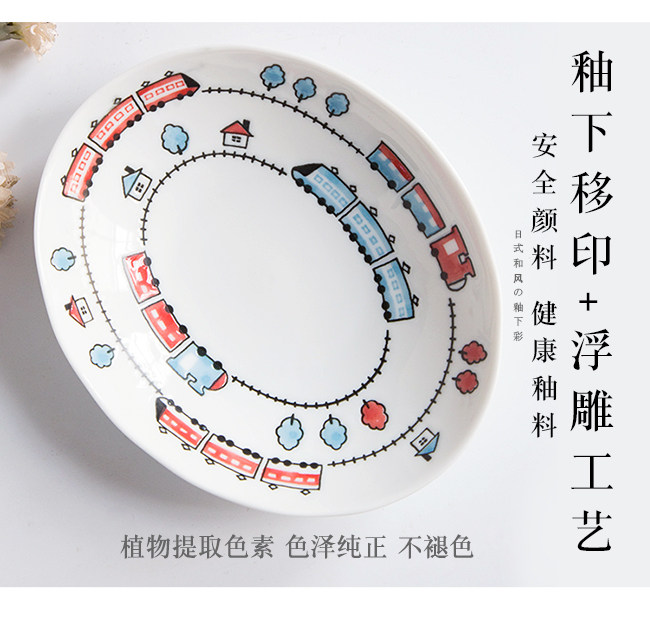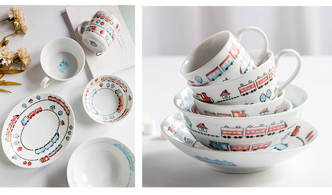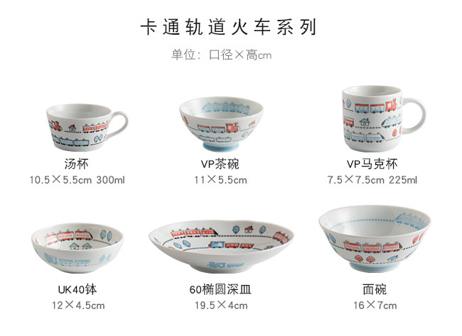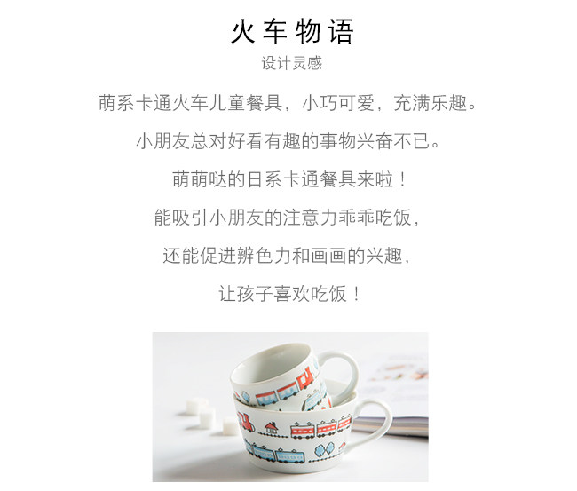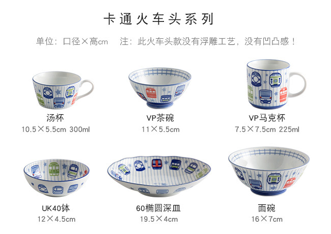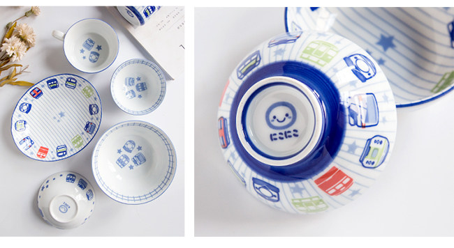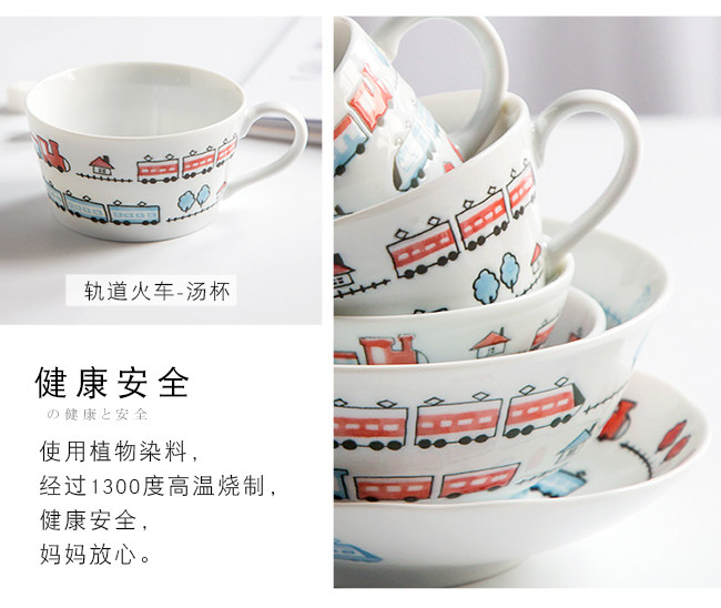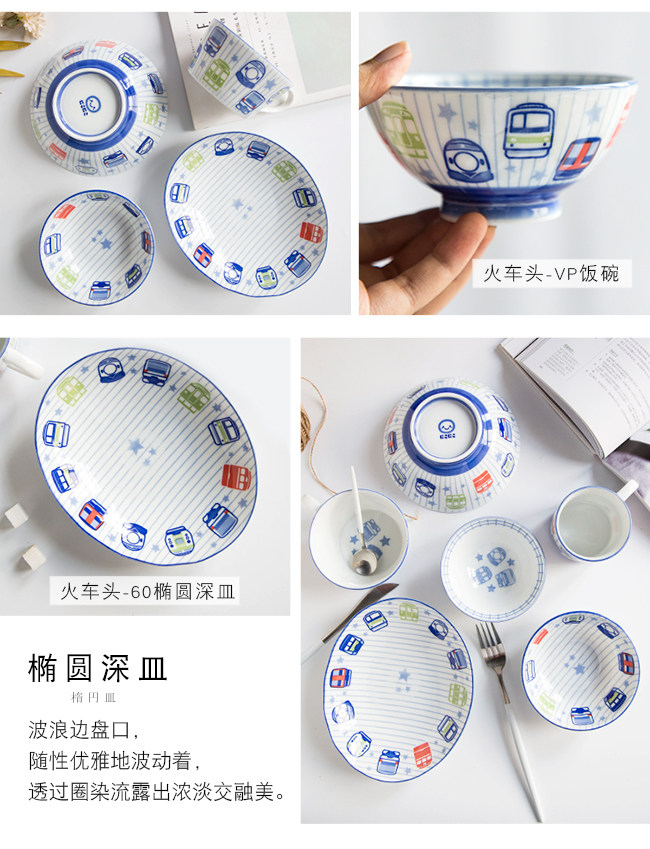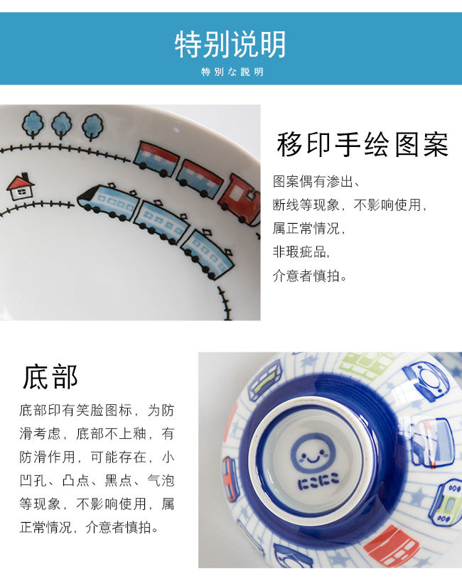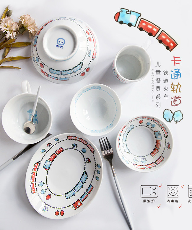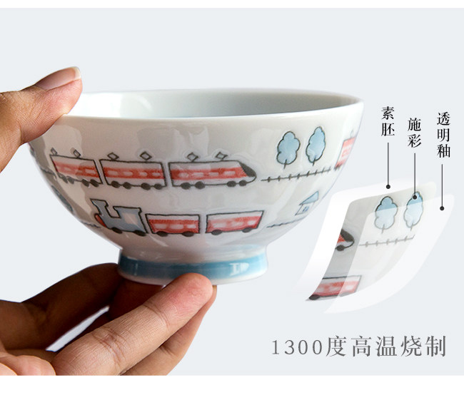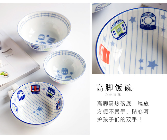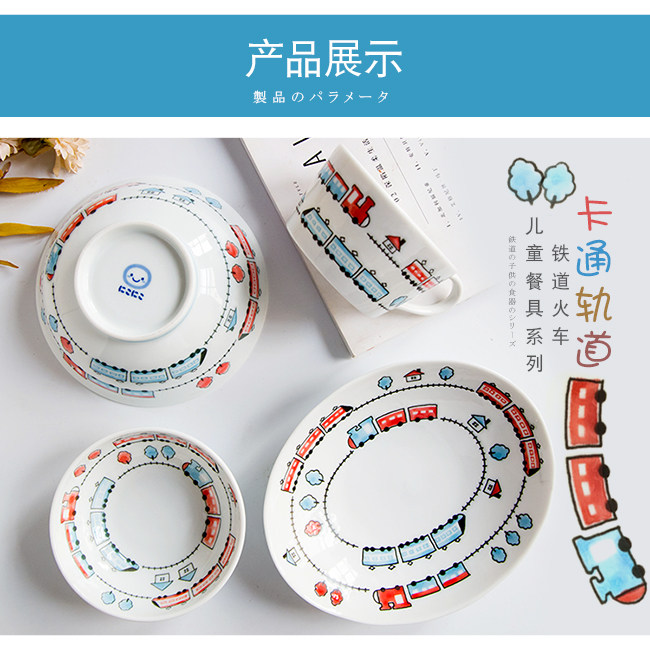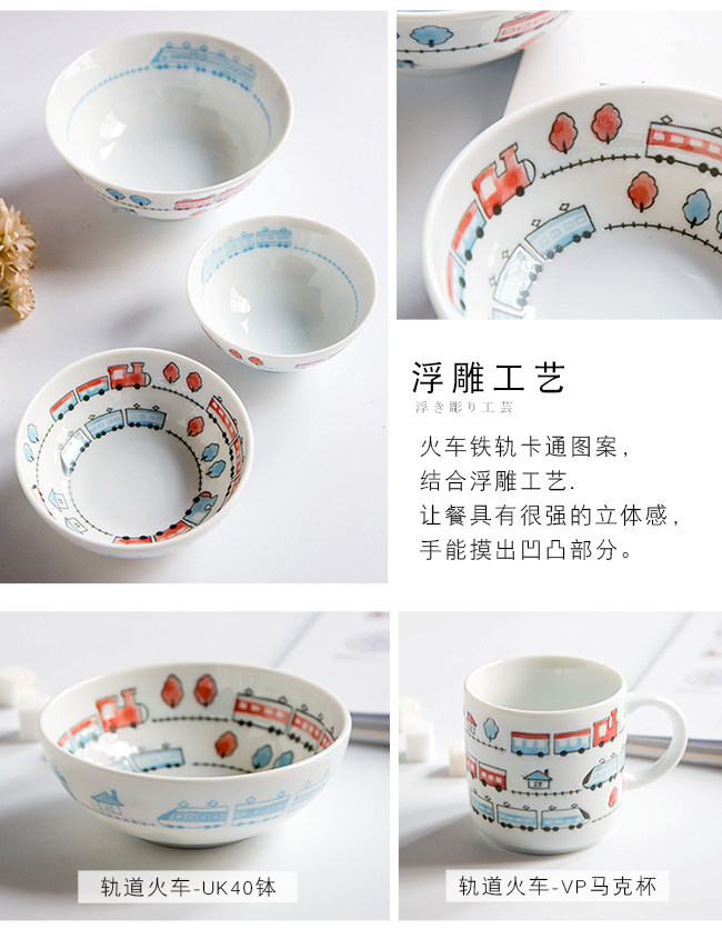 日本进口卡通碗套装,安全颜料,讲课釉料,日式和风の釉下彩,植物提取色素,色泽纯正,不褪色。萌系卡通火车儿童餐具,小巧可爱,充满乐趣。