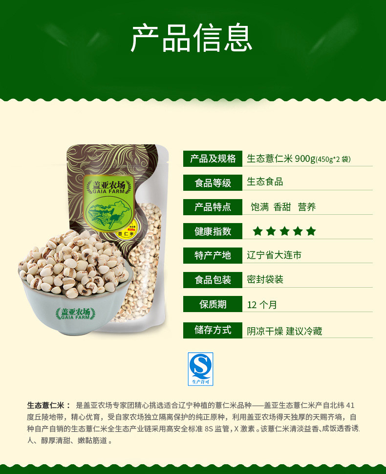 【盖亚农场】生态薏米,精耕细作自然天成,饱满香甜,有机营养,颗粒均匀,圆润饱满。