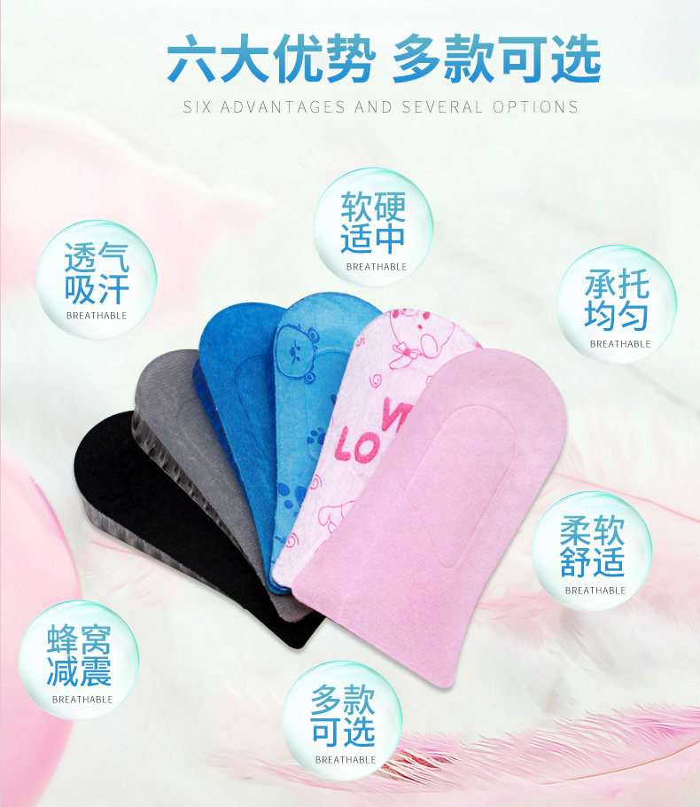 内增高鞋垫,舒适减震耐用,踩不榻,吸汗防臭,抗菌不臭脚。舒适新体验,会呼吸的鞋垫!