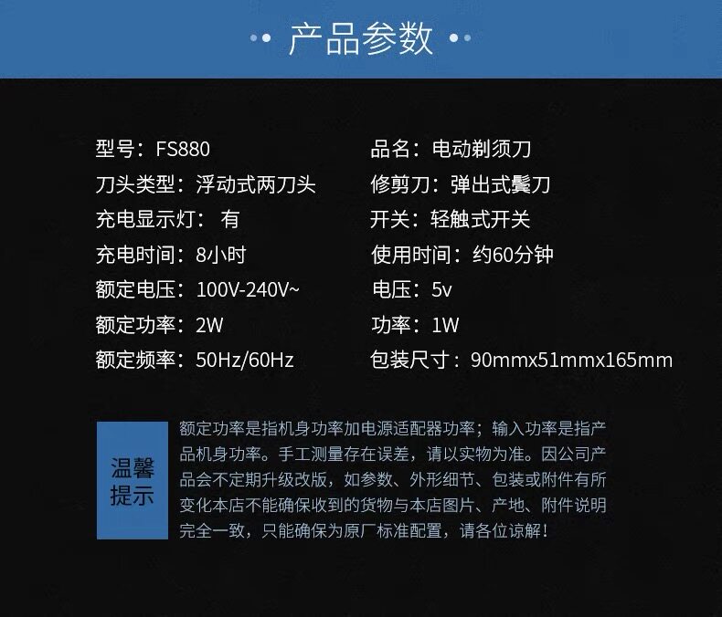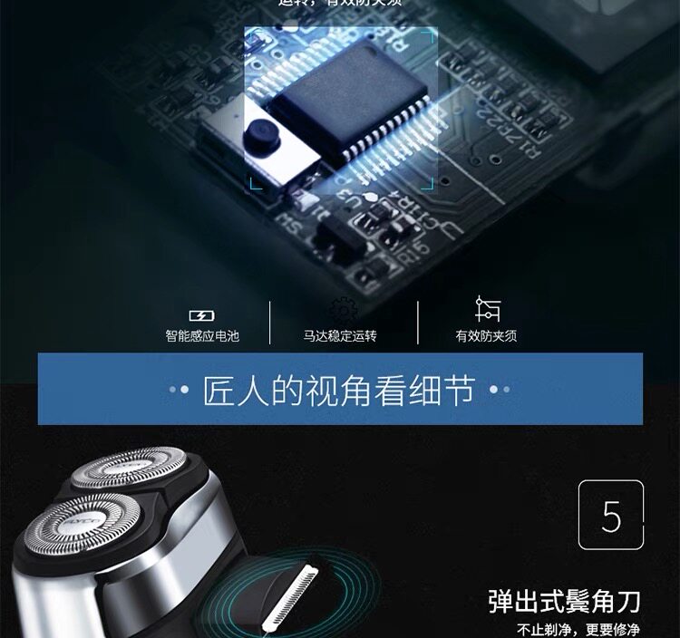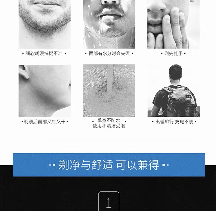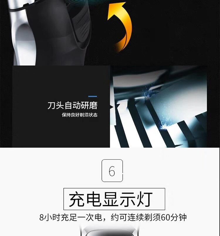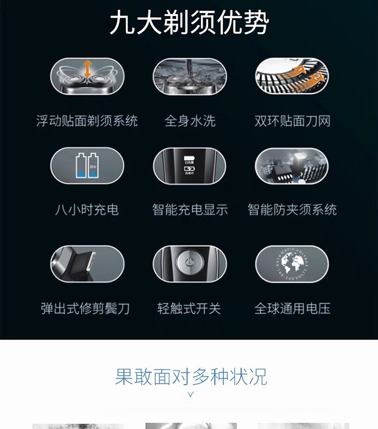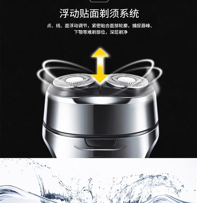 重磅升级!精工制作,双环贴面,自主研磨,锋利刀片,不伤肤,剃须更干净!LED智能充电显示,全身水洗,小巧便携,噪音小更安静,不一样的高品质剃须体验!