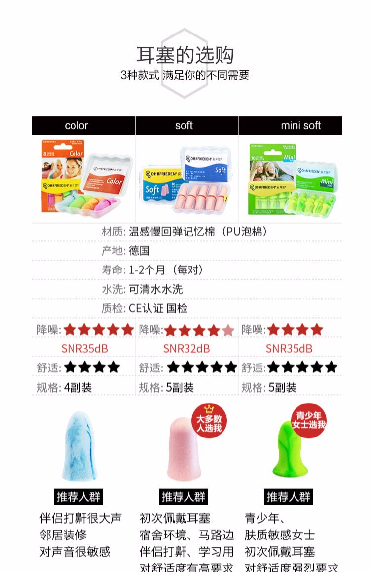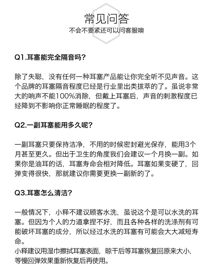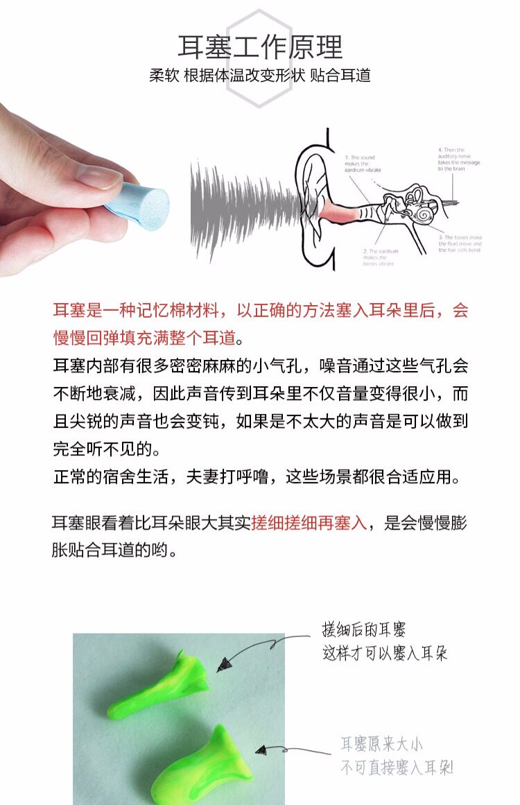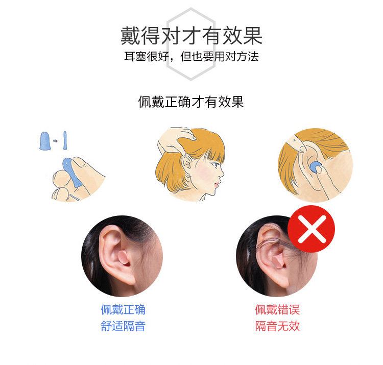 复合人体耳道的构造,不会对耳道造成多余的压力长时间带也不会痛,舒适体贴没有异物感,非一次性的耳塞,可以改善睡眠、集中精神、保护听力。