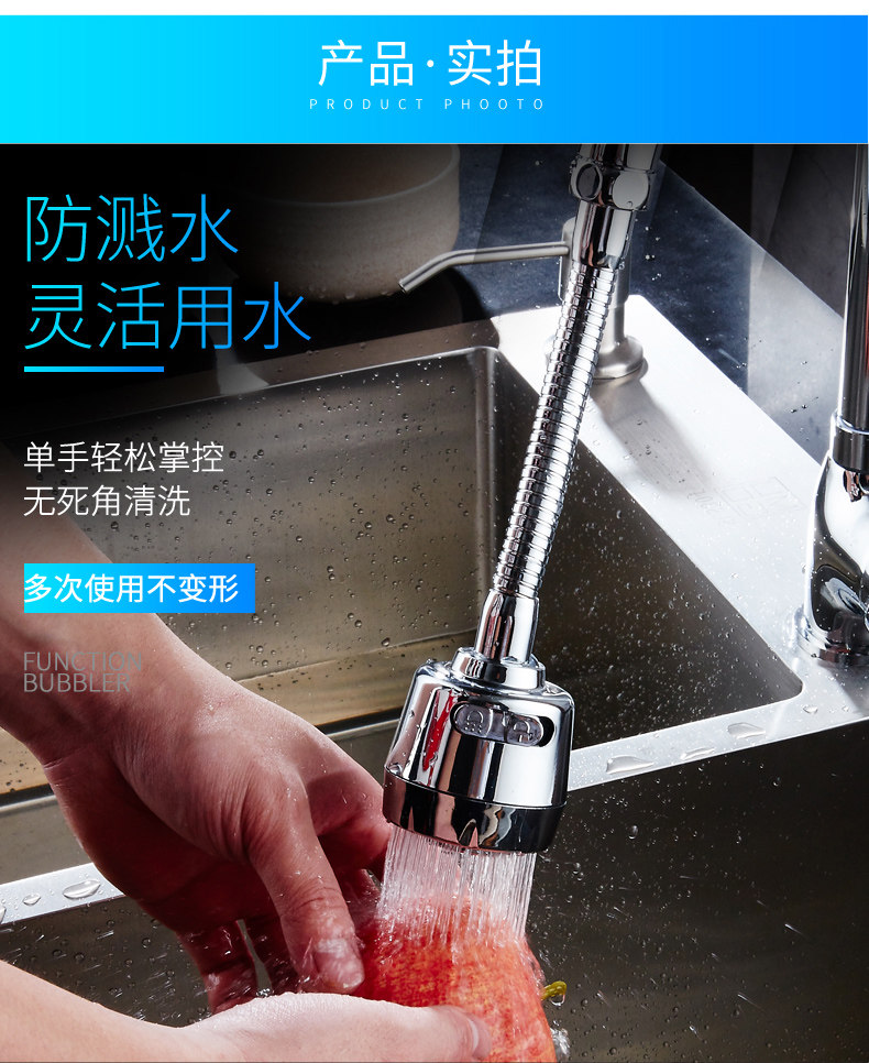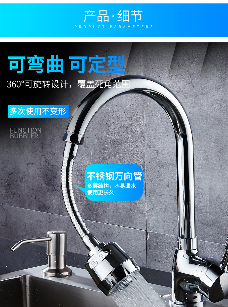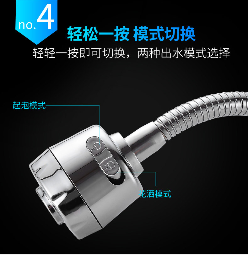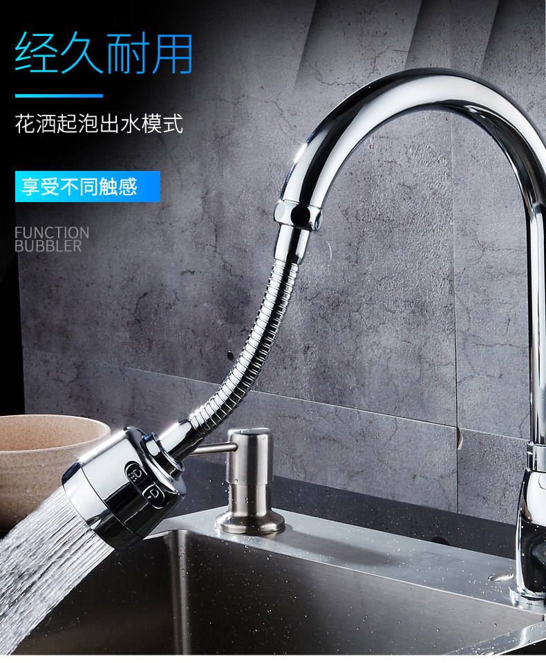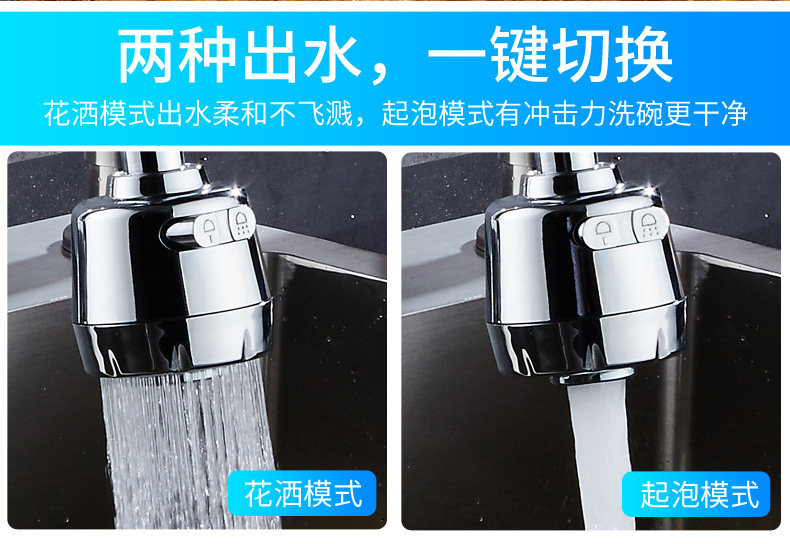 两种出水方式,360度旋转设计,可弯曲可定型,花洒模式出水柔和不飞溅,起泡模式有冲击力洗碗更干净!