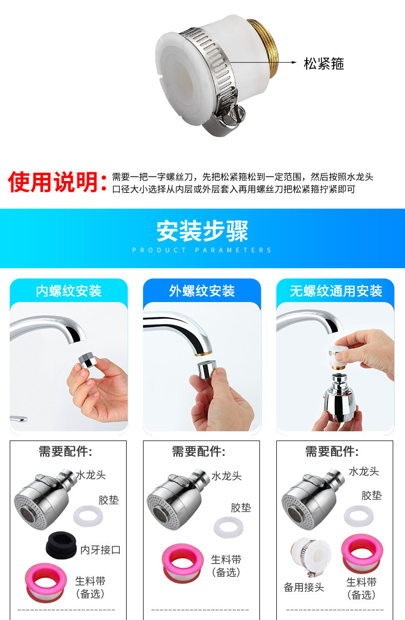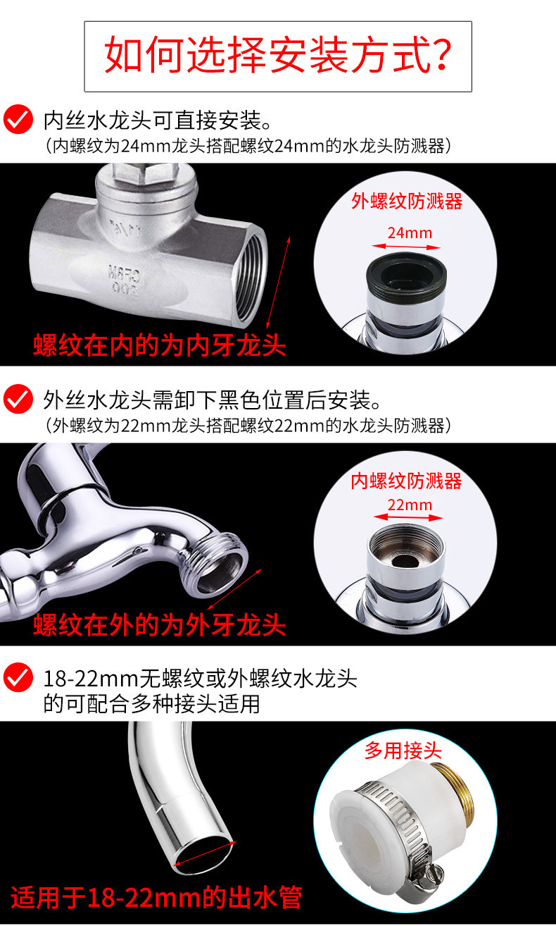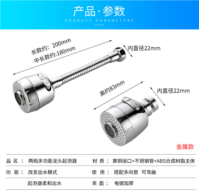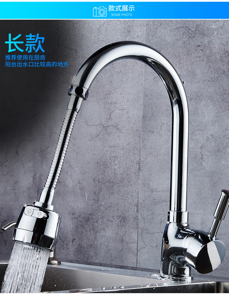两种出水方式,360度旋转设计,可弯曲可定型,花洒模式出水柔和不飞溅,起泡模式有冲击力洗碗更干净!