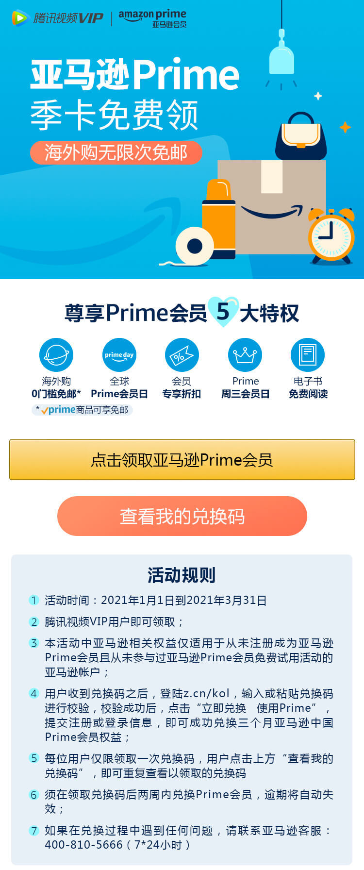 免费领取:腾讯视频VIP用户 亚马逊Prime会员季卡