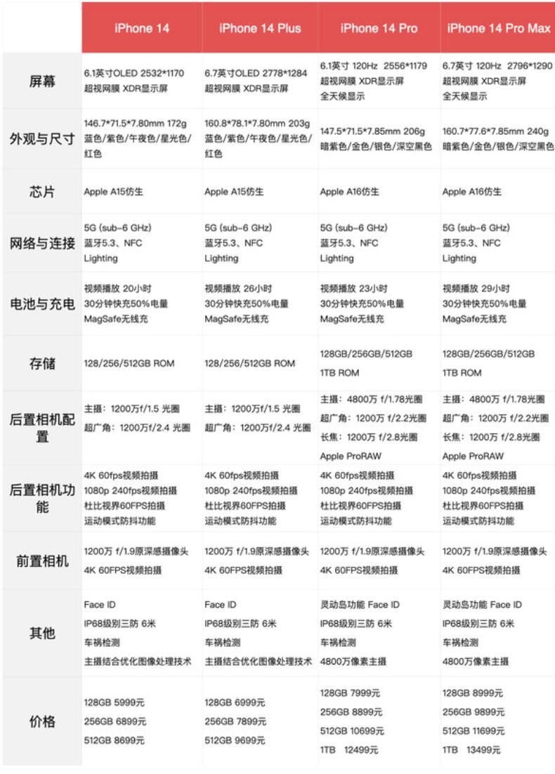 iPhone 14 Pro 共四种内存,其中128G价格为人民币7999元,256G价格为人民币8899元,512G价格为人民币10699元,1TB价格为人民币12499元;9月8日晚8点接受预购,9月16日发售。